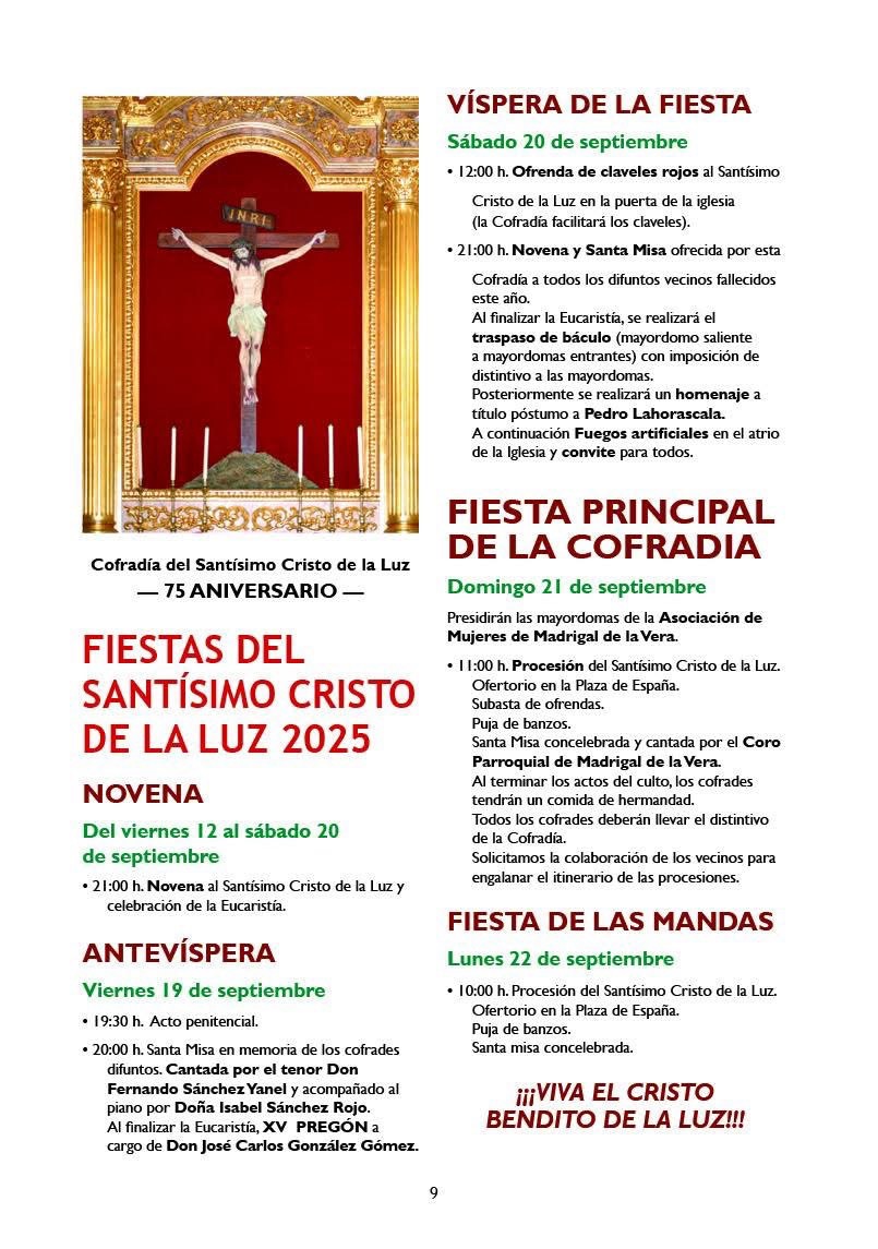 El 16 de septiembre comienzan las celebraciones religiosas y de ocio en honor del Cristo de la Luz en Madrigal de la Vera, un hito festivo en el calendario madrigaleño. Además de la Novena, la ofrenda de claveles, las procesiones y el ofertorio, el ayuntamiento ha programado un atractivo programa lúdico con tres salidas de las famosas vaquillas mojadas.